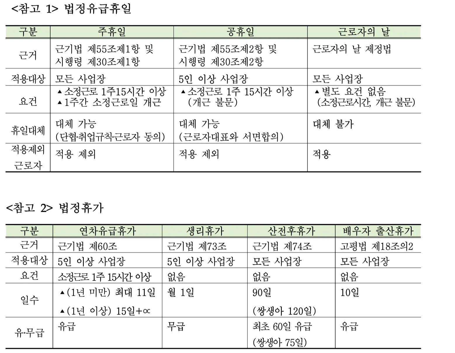 ◯ 2018.3.20. 「근로기준법」 개정(제55조제2항 신설) 및 같은법 시행령 개정으로(제30조제2항 신설) 사용자는 근로자에게 대통령령으로 정하는 휴일(「관공서의 공휴일에 관한 규정」 제2조 각호. 다만, 제1호는 제외한다)을 유급으로 보장해야 함