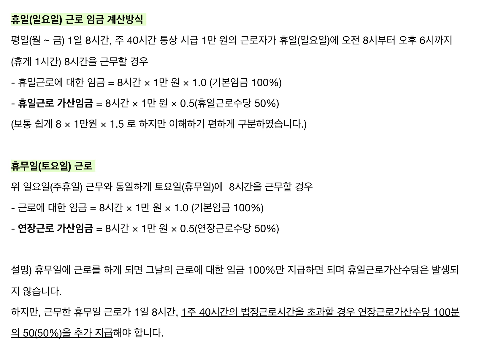 휴일, 휴무일 수당계산 : 휴일과 휴무일은 임금 계산이 다르게 산정됩니다. 휴일근로시 근로기준법 제56조에 의해 휴일근로수당 50%를 가산하여 지급해야 하며, 휴무일에 근로는 휴일근로수당이 발생하지 않습니다. 다만, 연장여부(1주40시간 초과)에 따라 연장수당이 지급되어야 합니다.
