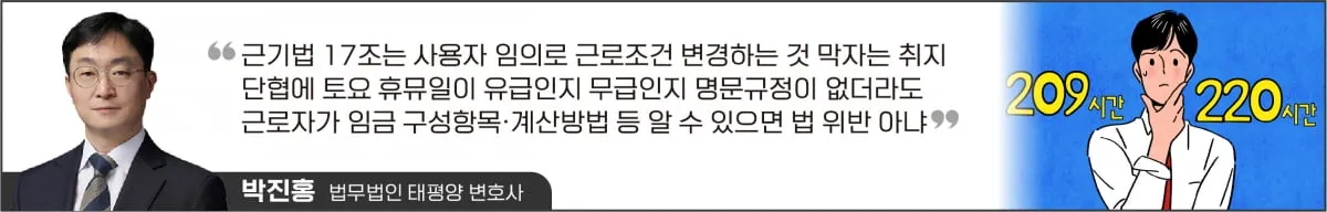 그러자 노동조합은 토요일을 ‘유급’ 휴일로 처리한다는 명문의 기재가 단체협약이나 취업규칙 어디에도 없으니 근로기준법 제17조를 위반하여 무효이고, 따라서 토요일은 ‘무급’ 휴일로 처리되어야 하며, 그 결과 통상임금 산정 기준시간 수는 토요일 무급을 기준으로 한 209시간이 되어야 하는데(근로기준법상 월 통상임금 산정 기준시간 수는 토요일 8시간이 유급처리되면 243시간, 토요일 4시간이 유급처리되면 226시간, 토요일이 유급처리되지 않고 무급처리되면 209시간이 된다), 단체협약에는 ‘통상임금 산정 기준시간은 220시간’이라고 되어 있으니 이 조항은 강행규정에 반하여 무효이고 209시간을 기준으로 시간급 통상임금을 산정해야 한다고 주장하면서 미지급 법정수당의 지급을 청구하였다.
