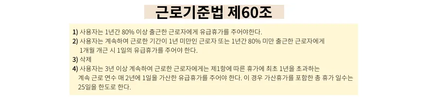 "1) 사용자는 1년간 80%이상 출근한 근로자에게 유급휴가를 주어야한다. 2) 사용자는 계속하여 근로한 기간이 1년 미만인 근로자 또는 1년간 80퍼센트 미만 출근한 근로자에게 1개월 개근 시 1일의 유급휴가를 주어야 한다. 3) 삭제 4) 사용자는 3년 이상 계속하여 근로한 근로자에게는 제1항에 따른 휴가에 최초 1년을 초과하는 계속 근로 연수 매 2년에 대하여 1일을 가산한 유급 휴가를 주어야한다. 이 경우 가산휴가를 포함한 총 휴가 일수는 25일을 한도로 한다."