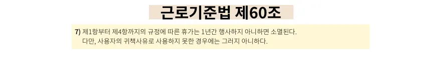 근로기준법 제60조 제7항에 따르면 "7) 제1항부터 제4항까지의 규정에 따른 휴가는 1년간 행사하지 아니하면 소멸된다. 다만, 사용자의 귀책사유로 사용하지 못한 경우에는 그러지 아니하다."고 규정하고 있습니다.