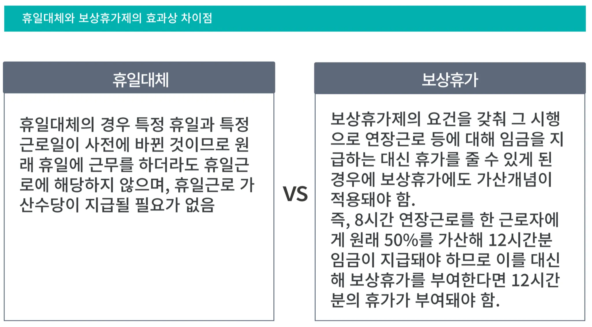 보상휴가제는 임금 지급에 갈음해 휴가를 부여하는 제도이기 때문에 근로자가 휴가를 사용하지 않은 경우, 이에 대한 임금을 지급해야 하며 보상휴가 사용기간 동안 사용자의 귀책사유 없이 근로자가 미사용한 경우에도 임금이 지급되어야 합니다. (보상휴가제도와 휴일대체제도는 분명히 다른 제도입니다!)