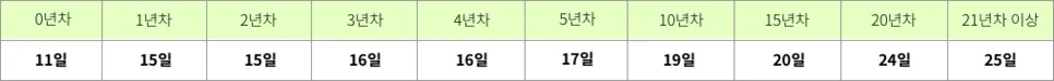 근속기간 2년 이상의 근로자 : 근속기간이 2년 이상인 근로자 중 출근율을 충족한 경우, 기존의 연차 유급휴가 부여방식과 동일하게 근속시작일에 15일의 연차 유급휴가가 부여됩니다.
